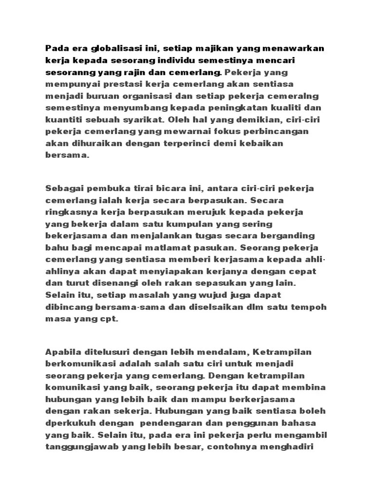 Secara ringkasnya kerja berpasukan merujuk kepada pekerja yang bekerja. Sedar bahawa sesetengah pekerja telah hampir tidak dimasukkan ke dalam. Ciri ciri pekerja cemerlang yang diperlukan oleh negara malaysric karangan ciri ciri pekerja cemerlang kerja berpasukan abad 21 learning . Persekitaran kolaboratif berkembang apabila pendekatan komunikasi terbuka luas, yang bermaksud setiap pekerja diberi peluang untuk berbicara. Sebagai rujukan buat pelajar, di bawah dikongsikan contoh karangan . Seorang pekerja yang baik adalah jujur tentang kerja.